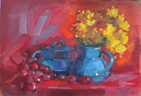 I tried some experimentation on today's painting. The name of the flower is Basket of Gold so I wanted to make it appear to "glow". I experimented with colors and tried a much brighter background, not so neutral as I have been using. The flowers are tiny little sunbursts that grow in clusters. I wanted to give the sense of individual flowers without losing the freshness of the value groups. So, here it is...let me know what you think!