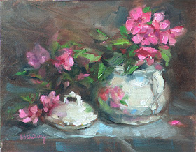 So... my last post was about intense glow, using color to create the drama.  Today's post is really just the opposite..I wanted to create a sense of quiet, peacefulness.  The soft pastel colors and delicate handling of the sugarbowl and flowers is meant to bring the viewer to a more contemplative mood.  The sugarbowl has an antique charm about it.  Our world seems to have lost so much of it's appreciation for "delicacy".  Now-a-days we want bold, powerful, colorful glitz and glamour.  Sometimes it's just nice to appreciate something that is quietly beautiful.