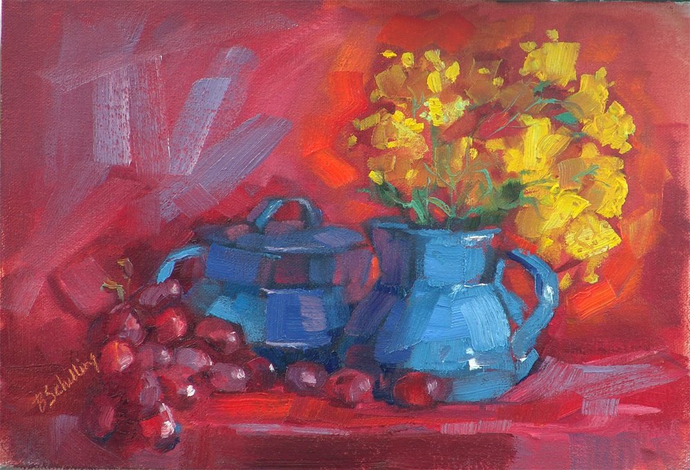 So... my last post was about intense glow, using color to create the drama. Today's post is really just the opposite..I wanted to create a sense of quiet, peacefulness. The soft pastel colors and delicate handling of the sugarbowl and flowers is meant to bring the viewer to a more contemplative mood. The sugarbowl has an antique charm about it. Our world seems to have lost so much of it's appreciation for "delicacy". Now-a-days we want bold, powerful, colorful glitz and glamour. Sometimes it's just nice to appreciate something that is quietly beautiful.
